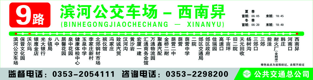 濱河公交車(chē)場(chǎng) - 保晉文化園 - 銀鷹金店 – 光大銀行 - 鄉(xiāng)鎮(zhèn)局 - 八中 - 居馨花園 – 泉 中花園 - 健康體檢中心 - 玉泉中學(xué) - 李家莊新村 - 北郊鋼材市場(chǎng) – 殯儀館 - 馮家莊 – 致誠(chéng)汽貿(mào) - 漢河溝 - 黃沙巖 - 匯通商務(wù)會(huì)館 - 萬(wàn)通物流園 - 聚鑫汽配 - 金橋二耐 - 蔭營(yíng)二中 - 蔭營(yíng) - 蔭營(yíng)中學(xué) - 二院 - 郊區(qū)交通運(yùn)輸局 - 郊區(qū)政府 - 佳瑞園 - 高速口 - 千畝坪 - 舊二院 - 天元回 收 - 楊樹(shù)溝 - 三郊口 - 新世紀(jì) - 三郊 - 前洼 - 耐火廠(金梢坪)- 韓莊 - 河南口 - 西南 舁 - 五里莊 - 雨下溝